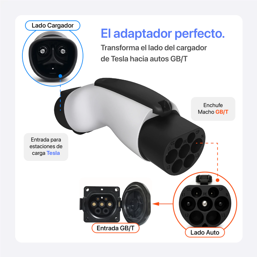 Con este adaptador Tesla a GB/T, puedes hacerlo de manera fácil, segura y rápida. Diseñado para quienes buscan movilidad sin límites, este accesorio te permite conectar tu vehículo eléctrico a la red de cargadores Tesla compatibles (AC).